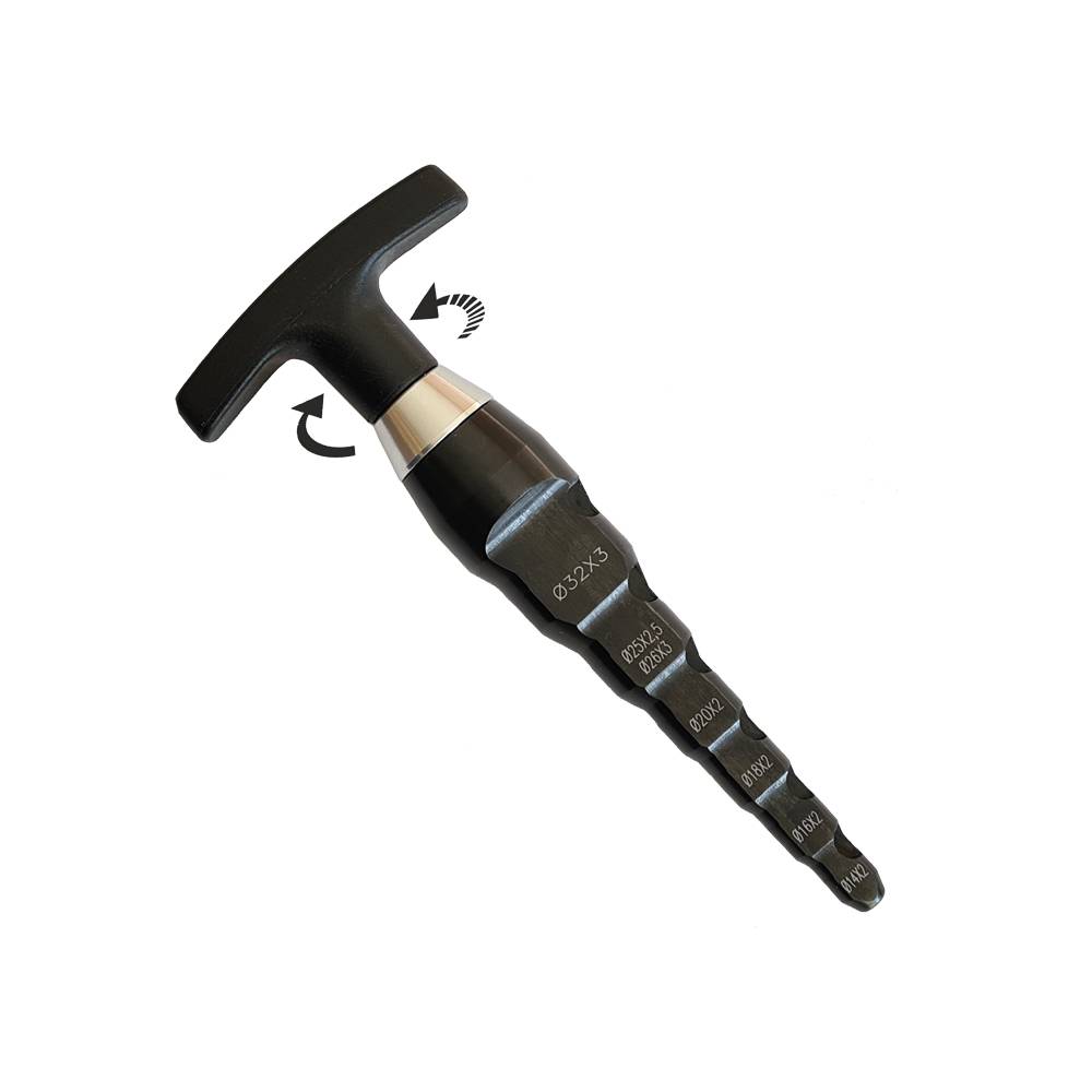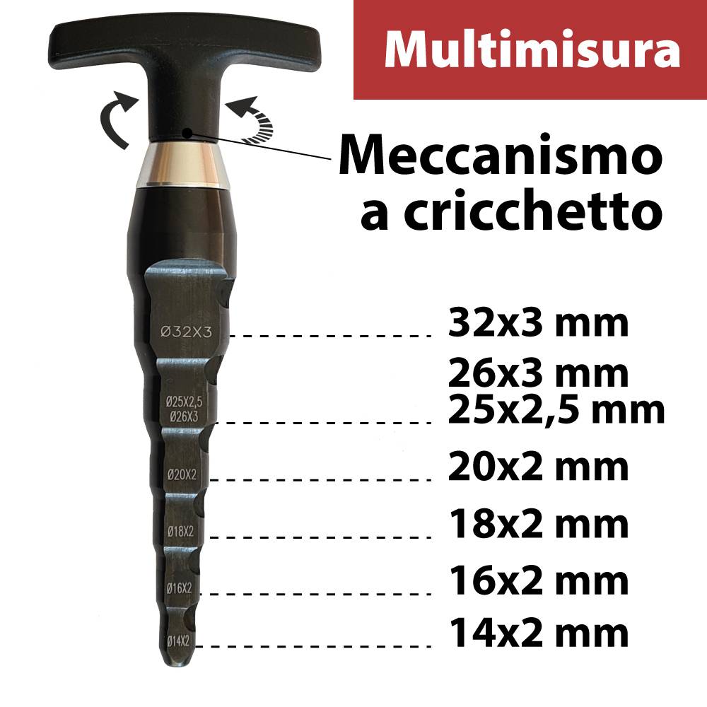 Meccanismo a cricchetto. Materiale: Acciaio speciale brunito. Misure: Ø14-16-18-20 x (2) mm / 25 x 2,5 mm / 26-32 x (3) mm. Adatto per sbavare la parte interna del tubo multistrato e 4 misure per ricalibrare il tubo dopo il taglio.