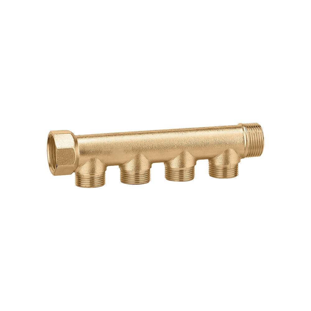 Uscite laterali Maschio da 1/2" Sede Conica. Interasse fra le uscite 37,5 mm. I collettori semplici sono generalmente utilizzati per la distribuzione del fluido termovettore negli impianti di climatizzazione e sanitari. Forniti di attacchi laterali permettono il collegamento a raccordi per tubazioni in rame, materiale plastico e multistrato. Materiale: Ottone CW617N UNI EN 12165 Pressione massima di esercizio: 10 bar. Temperatura di Esercizio: -10°C / +100°C. Massima percentuale di glicole: 30%.