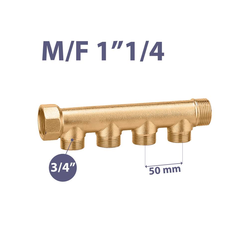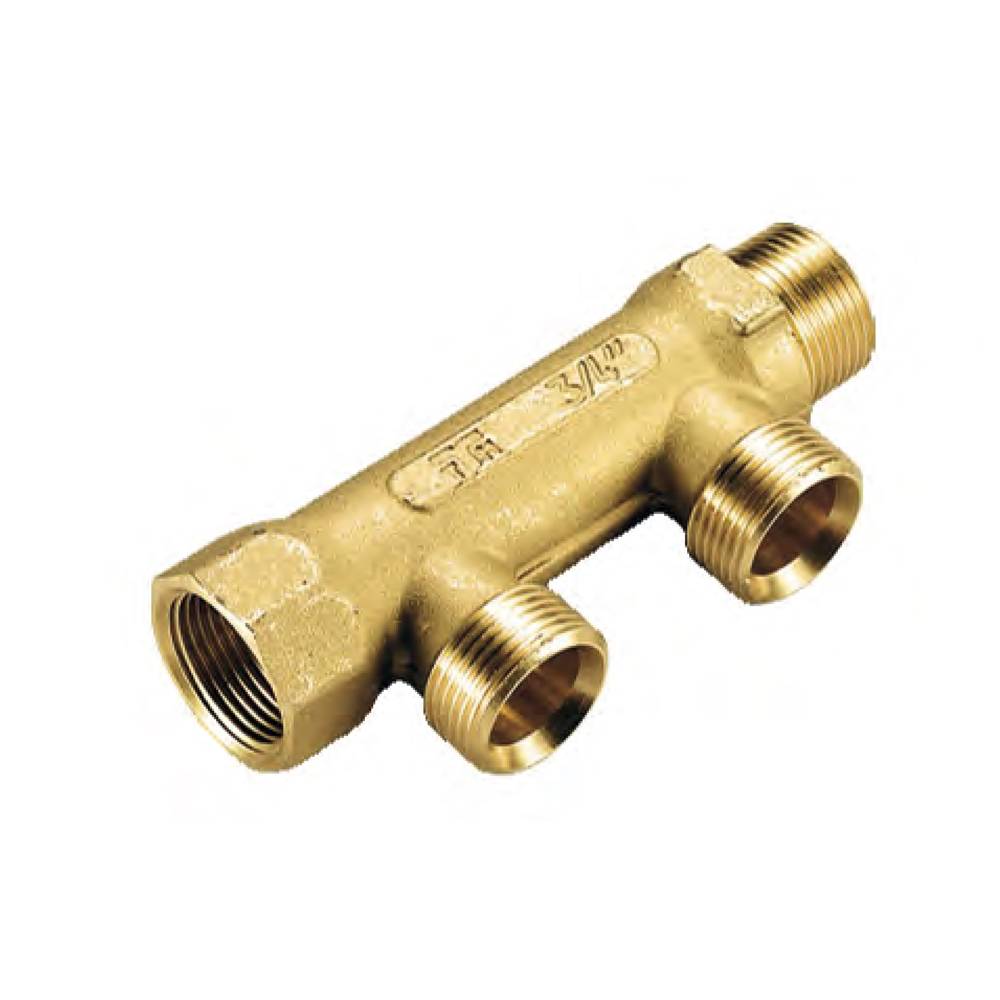 Uscite laterali Maschio da 3/4" Eurocono. Interasse fra le uscite 50 mm. I collettori semplici sono generalmente utilizzati per la distribuzione del fluido termovettore negli impianti di climatizzazione e sanitari. Forniti di attacchi laterali permettono il collegamento a raccordi per tubazioni in rame, materiale plastico e multistrato. Materiale: Ottone CW617N UNI EN 12165 Pressione massima di esercizio: 16 bar. Temperatura di Esercizio: -20°C / +200°C.