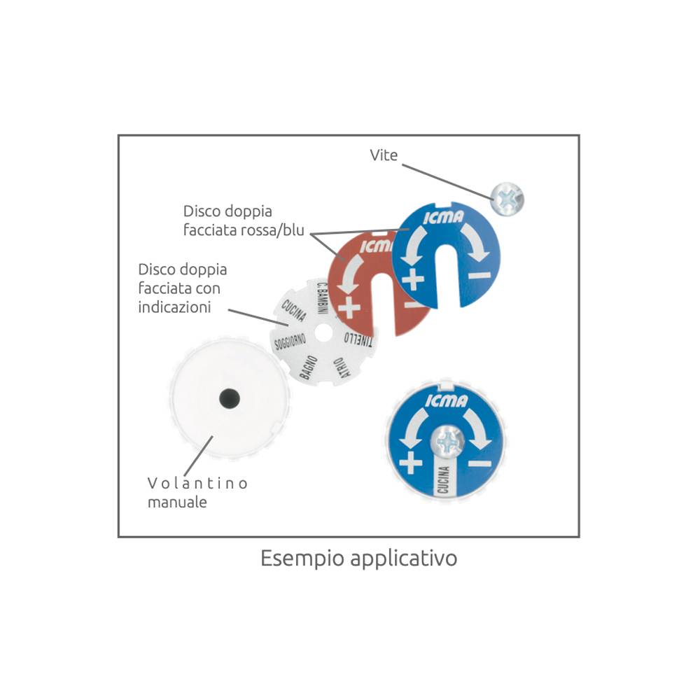 Collettore semplice assemblabile completo di valvole di intercettazione. Attacchi di testa da 3/4" gas e uscite laterali da 1/2" gas. Interasse fra le uscite laterali 50 mm. Targhette bifacciali blu-rossa e distribuzione sanitaria-riscaldamento incluse.