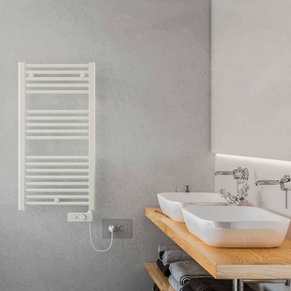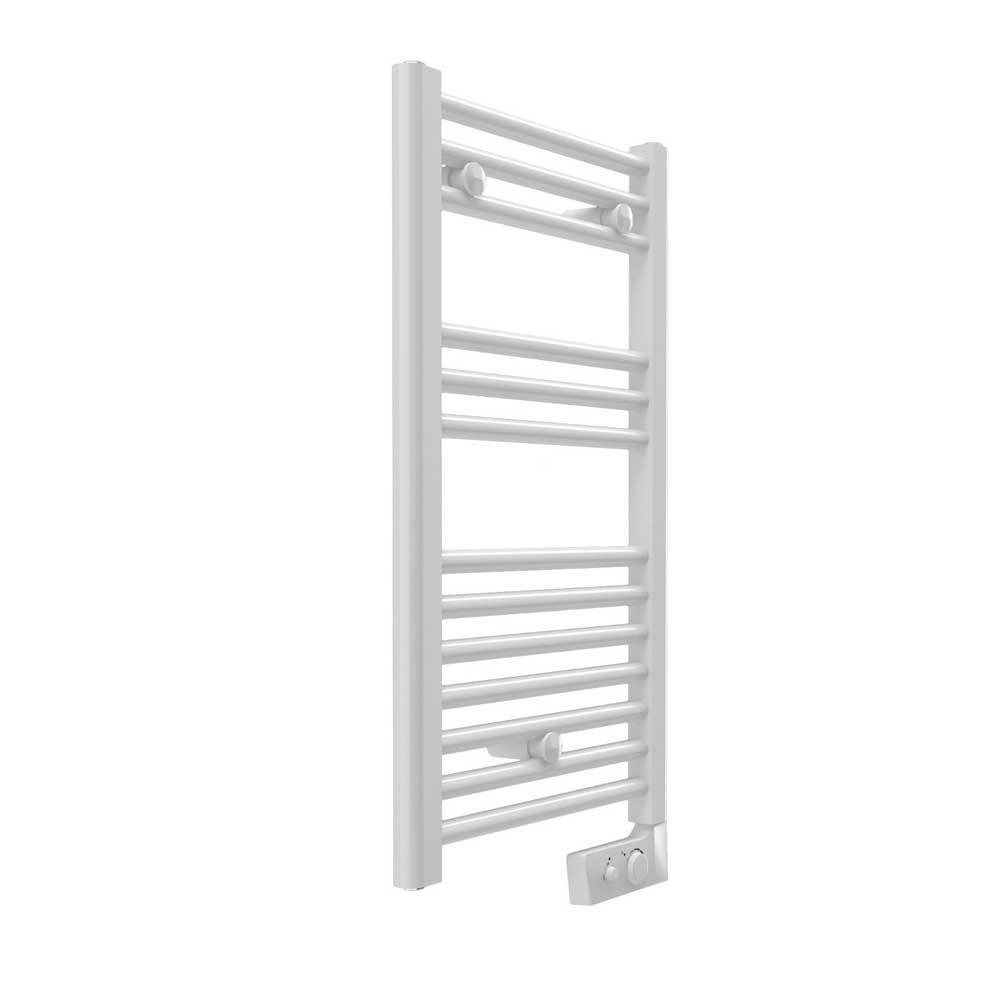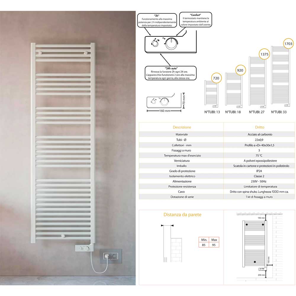 Radiatore da bagno in acciaio completamente elettrico dotato di termostato. Collettori laterali 40x30 mm e tubi orizzontali dm 22 mm saldobrasati con elementi di fissaggio. Con cronotermostato analogico non reversibile. Installazione come in Foto