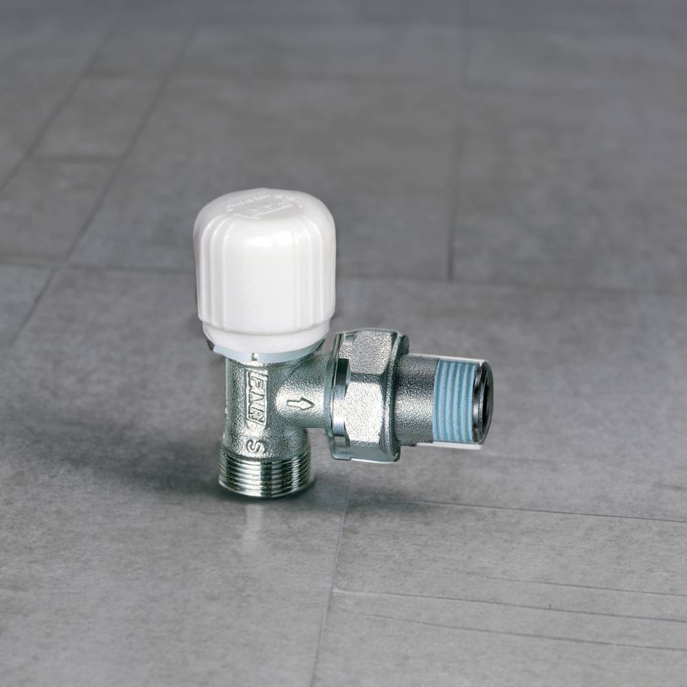 Valvola termostatizzabile a squadra cromata. - Attacco intercambiabile per tubo rame, plastica e multistrato. - Semplice sistema di estrazione volantino. - Perno inox con doppio o-ring di tenuta - Molla di richiamo rinforzata e otturatore piatto. - Codolo preguarnito con Loctite® Dri-Seal® 5061. Temperatura max di esercizio 95°C. Pressione max d'esercizio 10 bar.