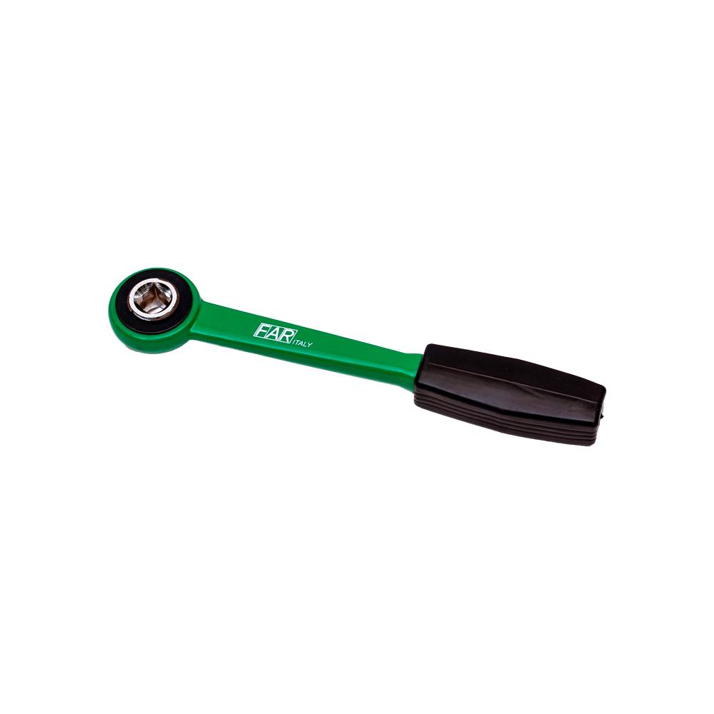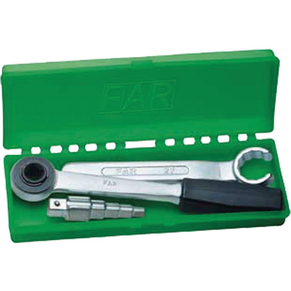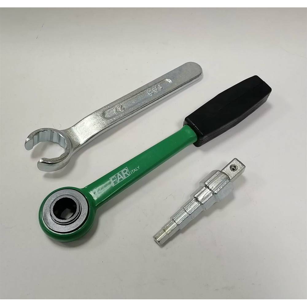 Astuccio contenente: - Chiave poligonale per calotte esagono 27 - Chiave a cricchetto per codoli 3/8"-1/2"-3/4"