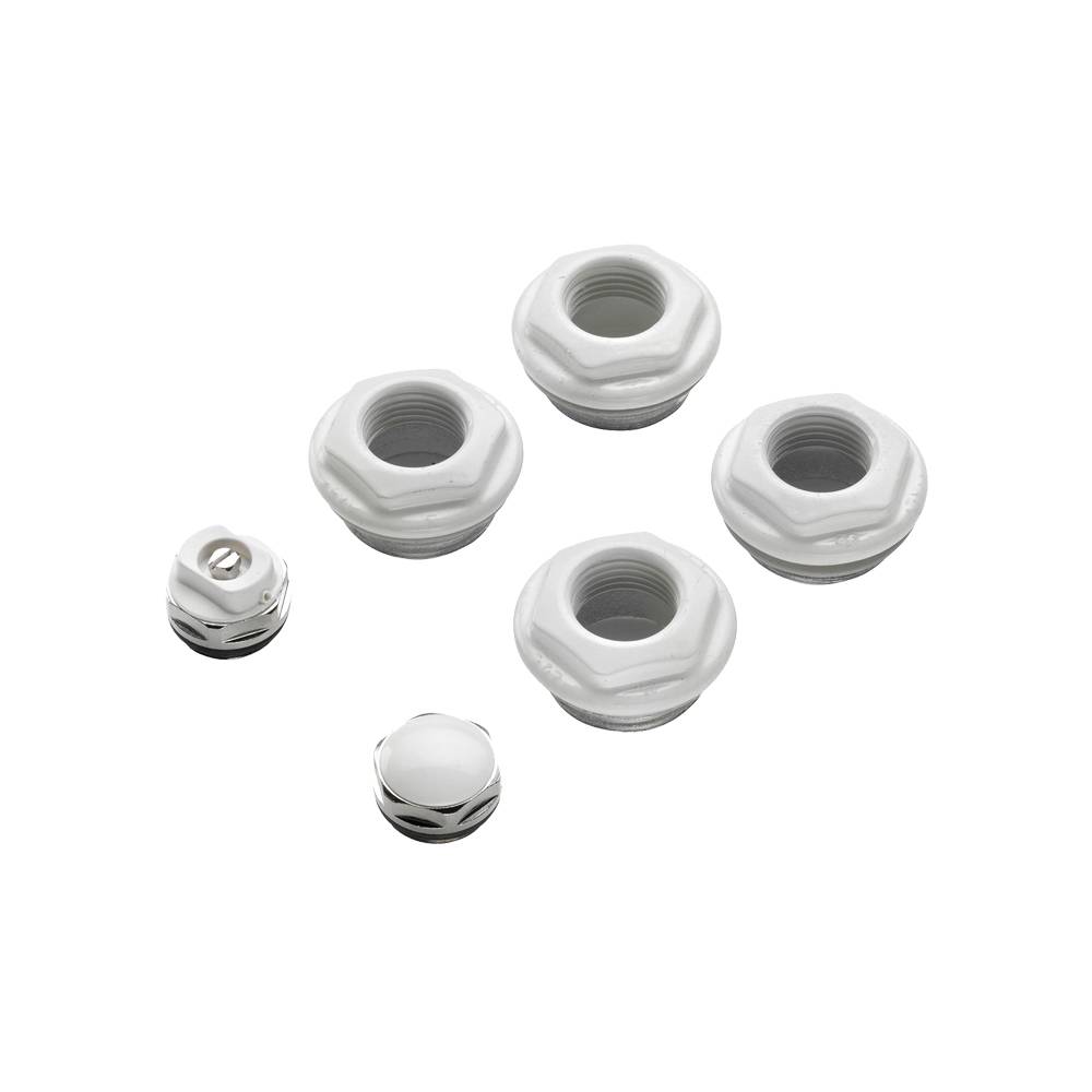 In dotazione: - Nr. 2 riduzioni con incavo flangia Dx con guarnizione; - Nr. 2 riduzioni con incavo flangia Sx con guarnizione; - Nr. 1 tappo in ottone cromato con cappuccio bianco e guarnizione O-RING montata; - Nr. 1 valvola di sfogo aria in ottone cromata con guarnizione montata e anello di chiusura in Teflon. Le guarnizioni sono O-RING in EPDM.