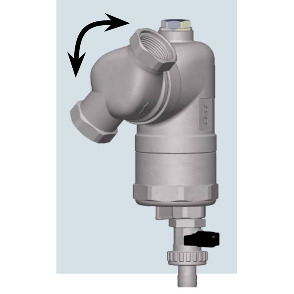 Defangatore orientabile cromato per impianti termici completo di magneti per l'eliminazione delle particelle ferrose. Corpo in ottone CB753S. Attacchi alle tubazioni: F-F. Attacco nella parte superiore da 1/2" con tappo. Rubinetto di scarico per evacuazione fanghi. Pressione nominale: 10 bar. Temperatura massima di esercizio:110°C. Magneti estraibili. Brevettato