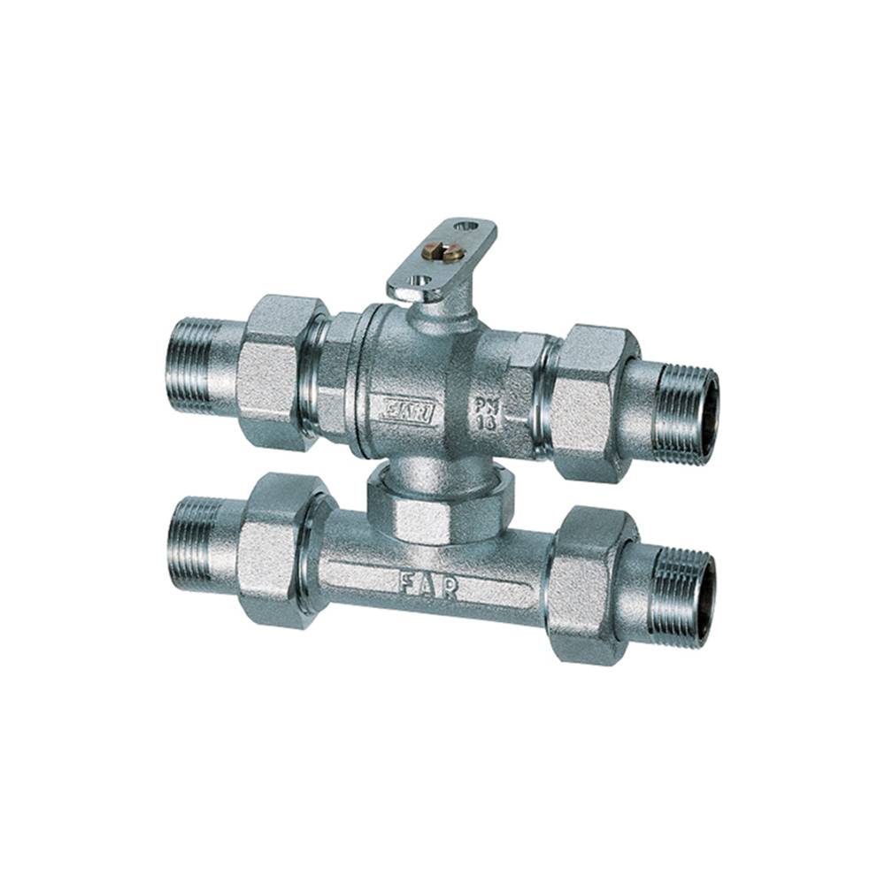 Valvola di zona a 3 vie MOTORIZZABILE cromata con sfera di by-pass completa di raccordo a T. Corpo valvola a sfera: ottone CW617N - Guarnizioni di tenuta: O-Ring in EPDM e sedi in PTFE. Pressione nominale: 16 bar. Pressione massima differenziale: 5 bar. Temperatura fluido: -10°C (con antigelo) + 100°C. Fluidi utilizzabili: acqua e acqua con glicole - Attacchi: maschio - Interasse regolabile da 52 mm a 63 mm
