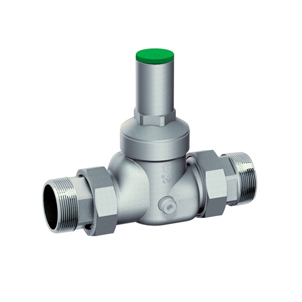 Riduttore di pressione cromato per impianti idrosanitari. Sede di tenuta: acciaio inox. Pressione regolabile a valle: da 1 a 6 bar - Pressione nominale: 25 bar - Temperatura massima d'esercizio: 75°C - Materiale di O-RING e guarnizioni: EPDM - Fluidi utilizzabili: acqua e aria. Chiave di regolazione compresa nella confezione. Attacchi di collegamento maschio-maschio. CON ATTACCO MANOMETRO