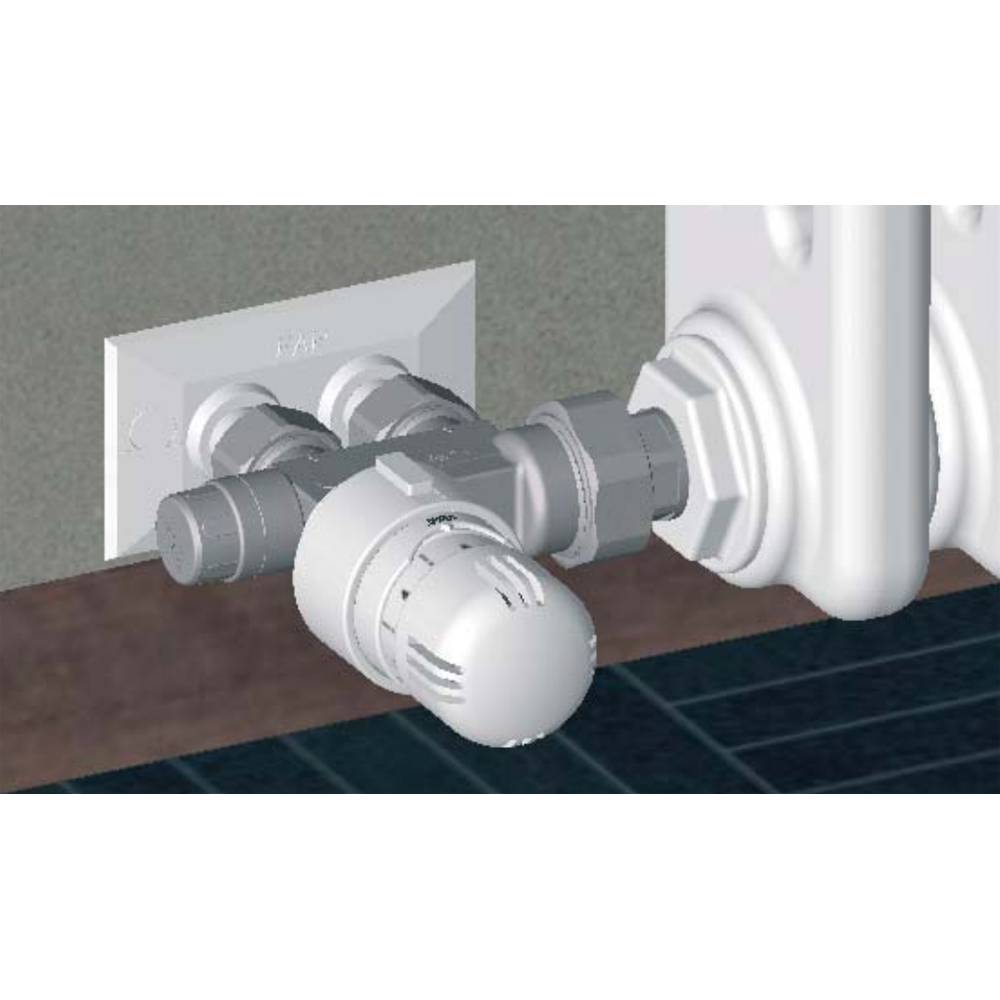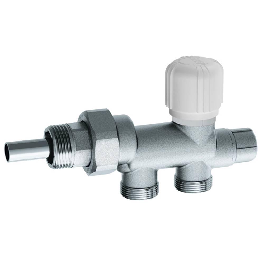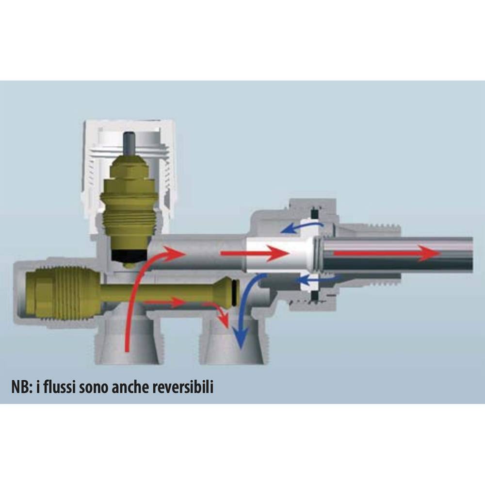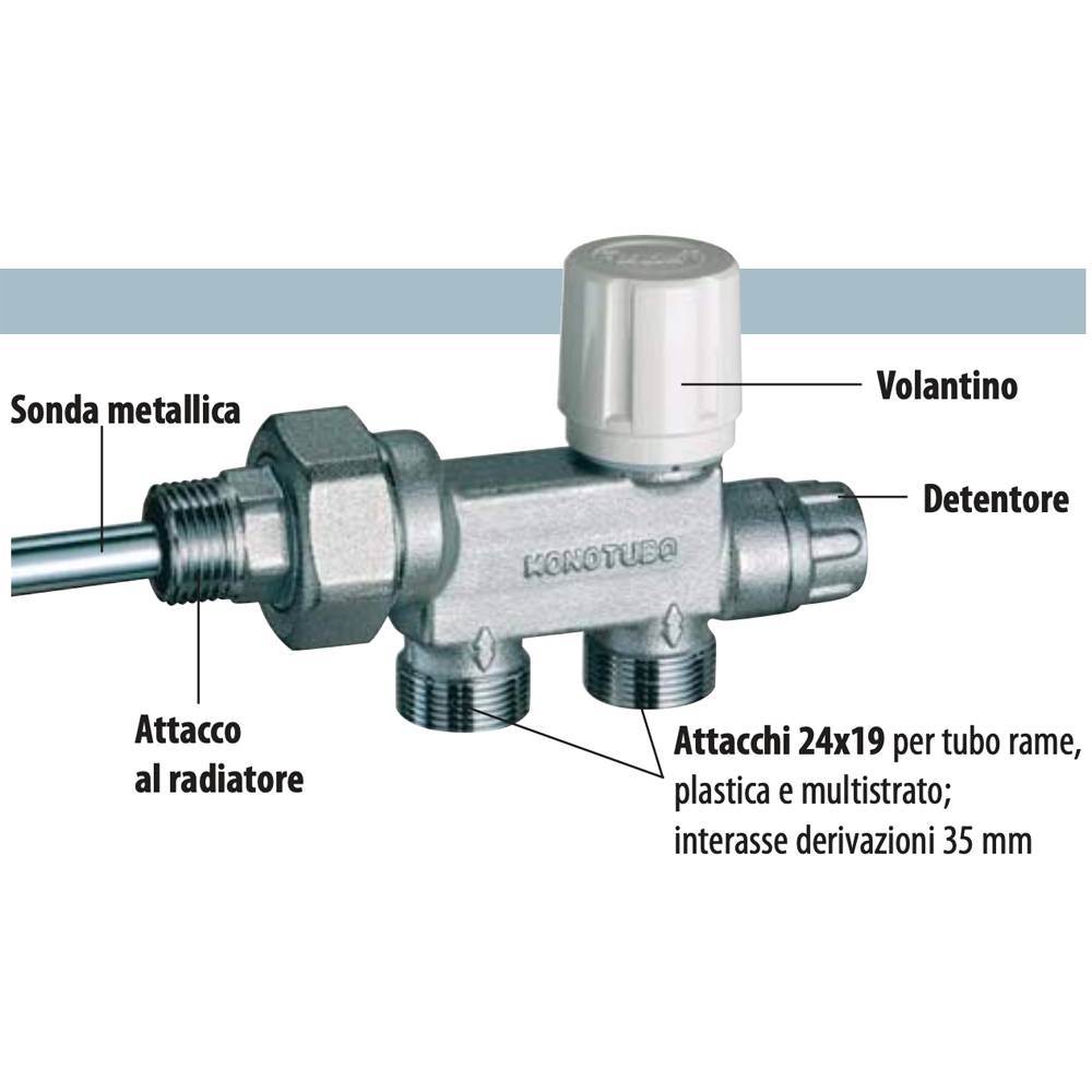 Valvola MONOTUBO termostatizzabile cromata. Attacchi intercambiabili per tubo rame, plastica e multistrato. Sonda metallica 450 mm ø12 mm. Interasse derivazioni 35 mm. Temperatura max di esercizio 95°C. Pressione max di esercizio 10 bar. Fluidi utilizzabili: acqua.