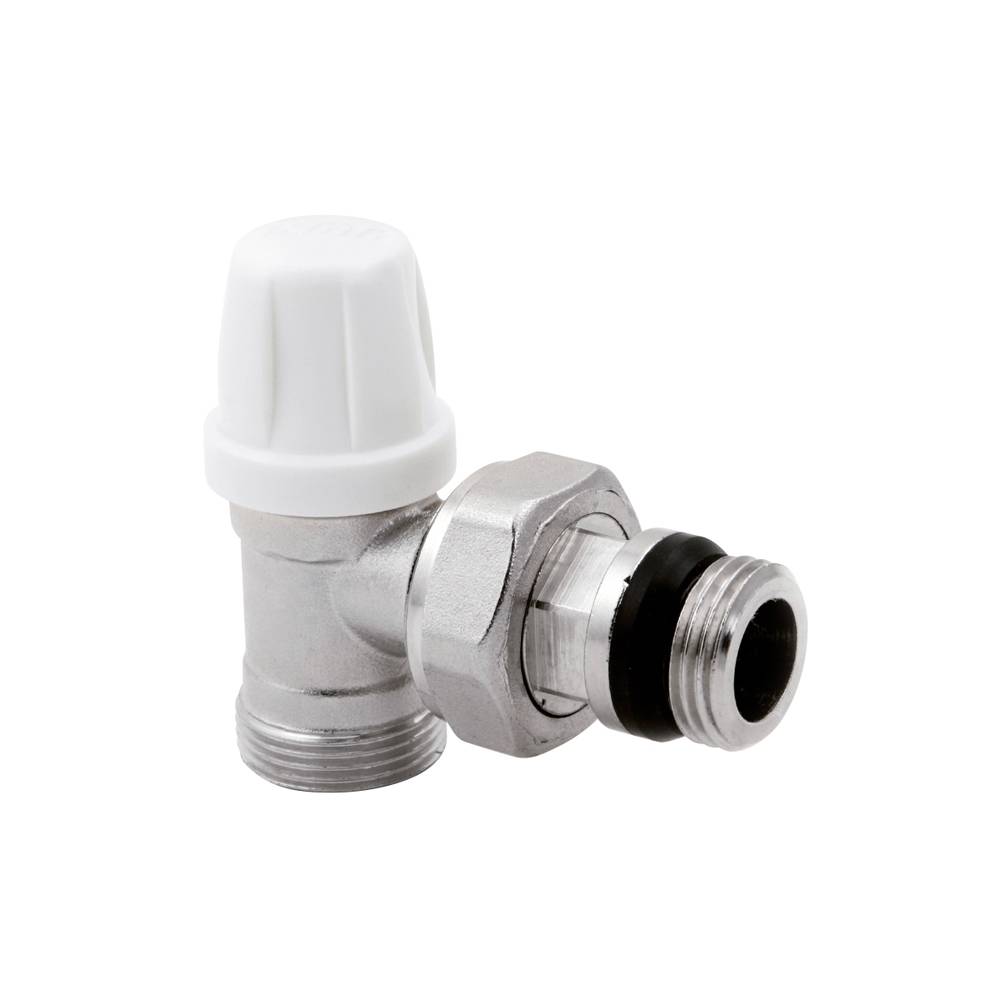 Detentore a squadra micrometrico, per tubo di rame, Multistrato, Pe-X. Doppia tenuta sulla sede, o-ring più tenuta metallica. Corredato di bocchettone antisgocciolamento. Fluidi impiegabili: Acqua e soluzione glicolicate. Max percentuale di glicole: 30%. Pressione max di esercizio: 10 bar. Pressione massima differenziale: 1 bar. Temperatura fluido termovettore 5°C / 120°C.