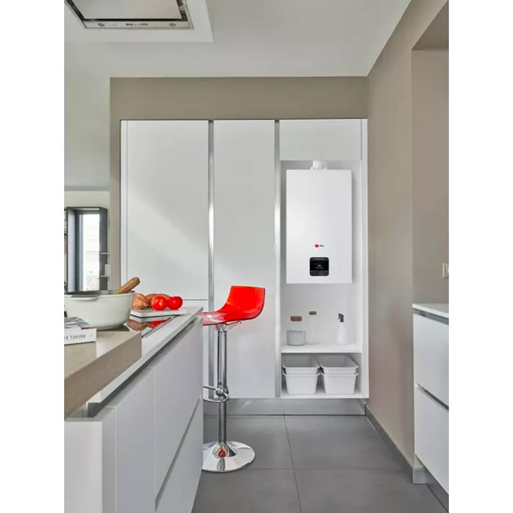Convertibile a propano automatico tramite una semplice regolazione automatica. Caldaia murale combinata a condensazione con microaccumolo e sistema Acquaspeed FAST. Il microaccumulo, rinnovato con i suoi 3 litri di acqua calda sempre disponibile grazie alla resistenza elettrica che la mantiene alla temperatura desiderata in modo costante, dona al cliente un comfort sanitario di alto livello. Rivoluzione interna ed esterna per essere pronta ad entrare nel futuro del segmento caldaie, ThemaFast Condens presenta un "cuore" nuovo che batte grazie al nuovo sistema di combustione FlameFit che garantisce un autoadattamento ai diversi gas di alimentazione e permette di utilizzare la caldaia con una miscela di gas contenente fino al 20% di idrogeno. Solar Easy: tutti i modelli della gamma ThemaFast Condens sono compatibili con tutti i sistemi solari. Se l'irraggiamento solare non è sufficiente a mantenere l'acqua sanitaria alla temperatura desiderata, la caldaia interviene ad integrazione.
