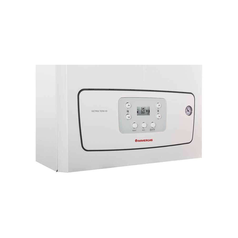 Le caldaie VICTRIX TERA V2 hanno ottenuto la certificazione Hydrogen Ready. VICTRIX TERA V2 può ora funzionare a metano, GPL, aria propanata e miscela fino al 20% di idrogeno. VICTRIX TERA V2 può essere collegata a canne fumarie collettive in pressione positiva grazie alle sicurezze in dotazione e con l'ausilio di uno specifico kit optional. Posizionamento: omologata per funzionare all'interno e all'esterno in luoghi parzialmente protetti. Protezione elettrica IPX5D. Antigelo di serie fino a -5 °C. Sgravi fiscali: può usufruire delle detrazioni fiscali in vigore. Basso consumo: il circolatore a basso consumo consente un notevole risparmio di energia elettrica. Efficienza stagionale 94%: la caldaia può raggiungere una classificazione energetica maggiore (A+), se abbinata a un termoregolatore evoluto (CARV2) e sonda esterna. Semplicità di utilizzo: pratici pulsanti e un display retroilluminato permettono di gestire e visualizzare facilmente l'impostazione della caldaia. Formula Comfort 10: si avvale del programma di manutenzione più completo della durata di 10 anni senza costi di attivazione, con la possibilità di estenderla fino a 15 anni. In collaborazione con il Centro Assistenza Autorizzato Immergas, si può attivare in occasione della verifica iniziale.