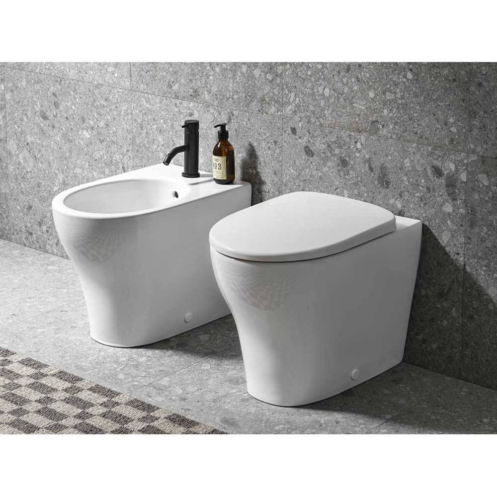 Fissaggi Nascosti inclusi nella confezione. Vaso a cacciata. Senza Brida di Risciacquo. Completo di Sedile coprivaso avvolgente.
