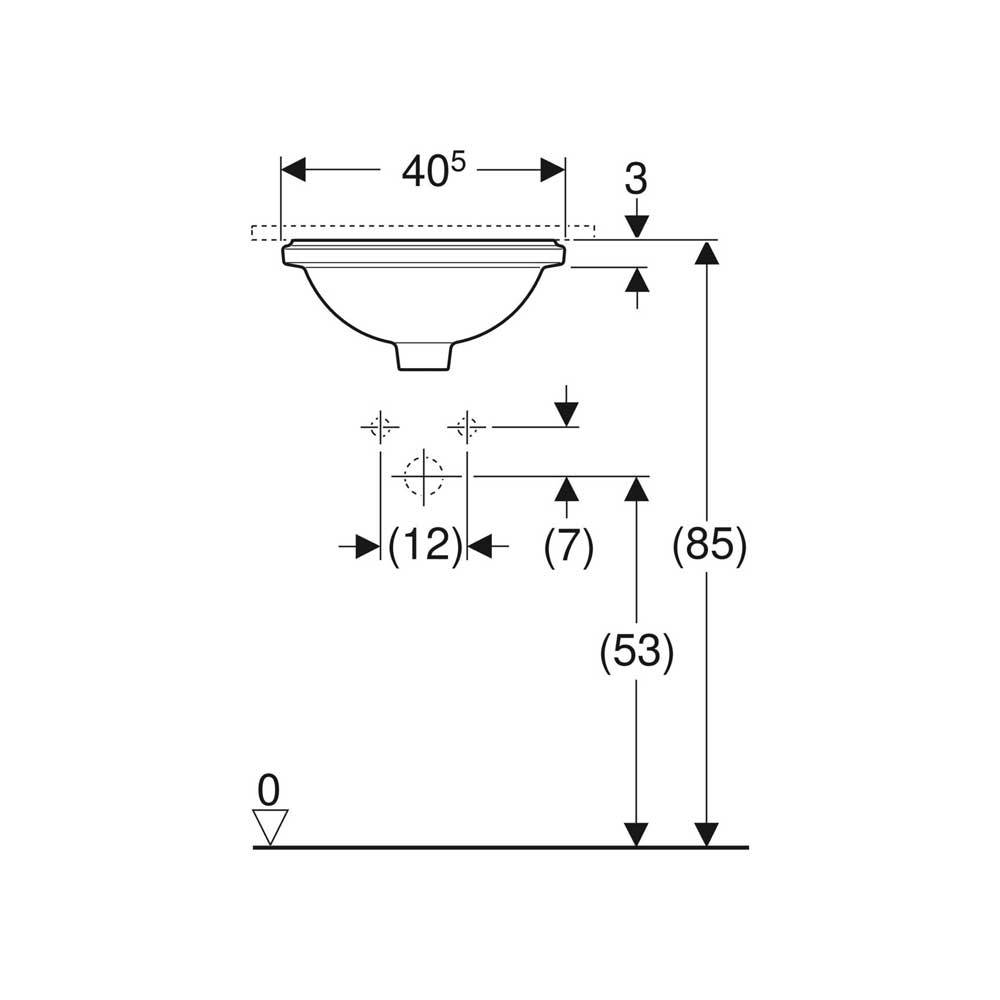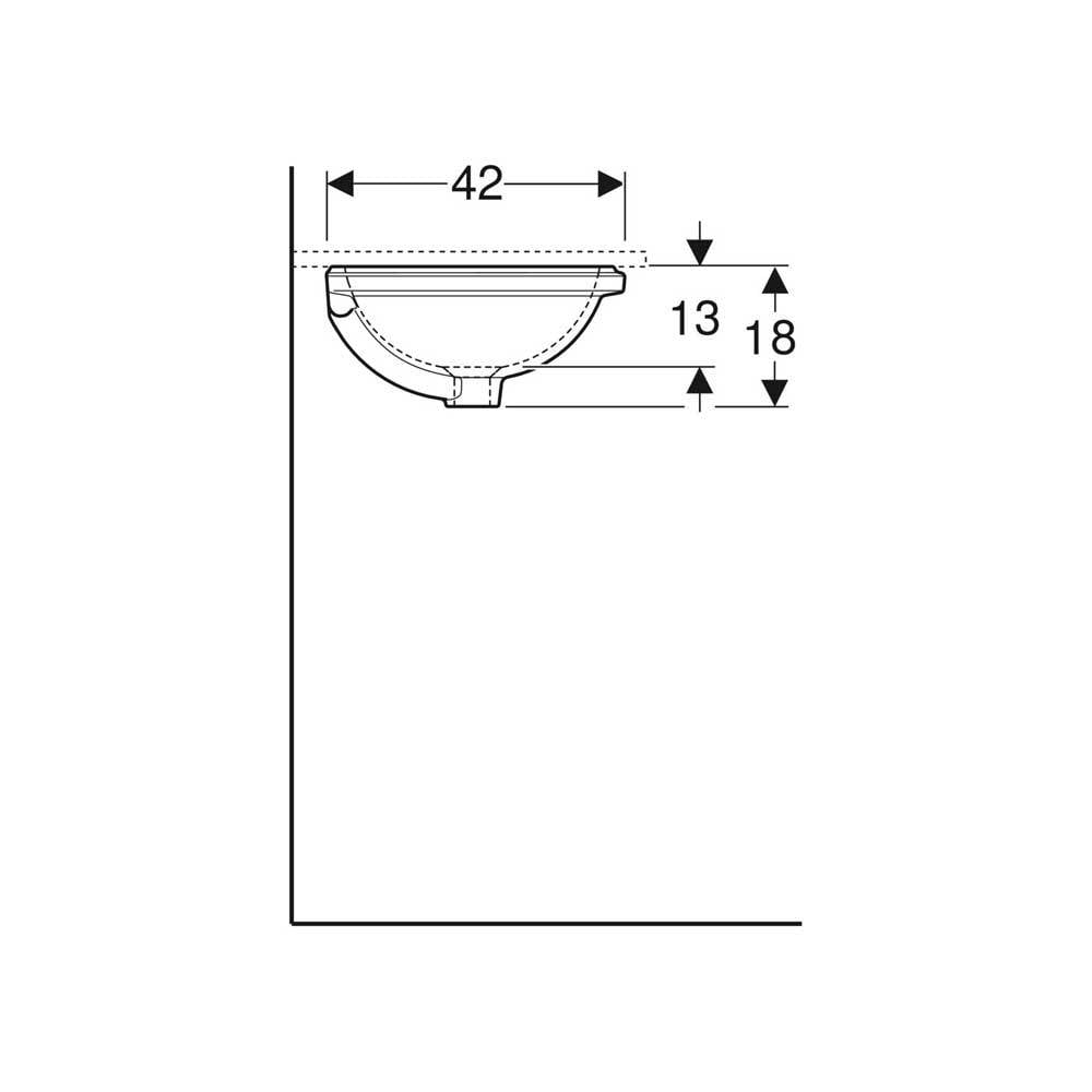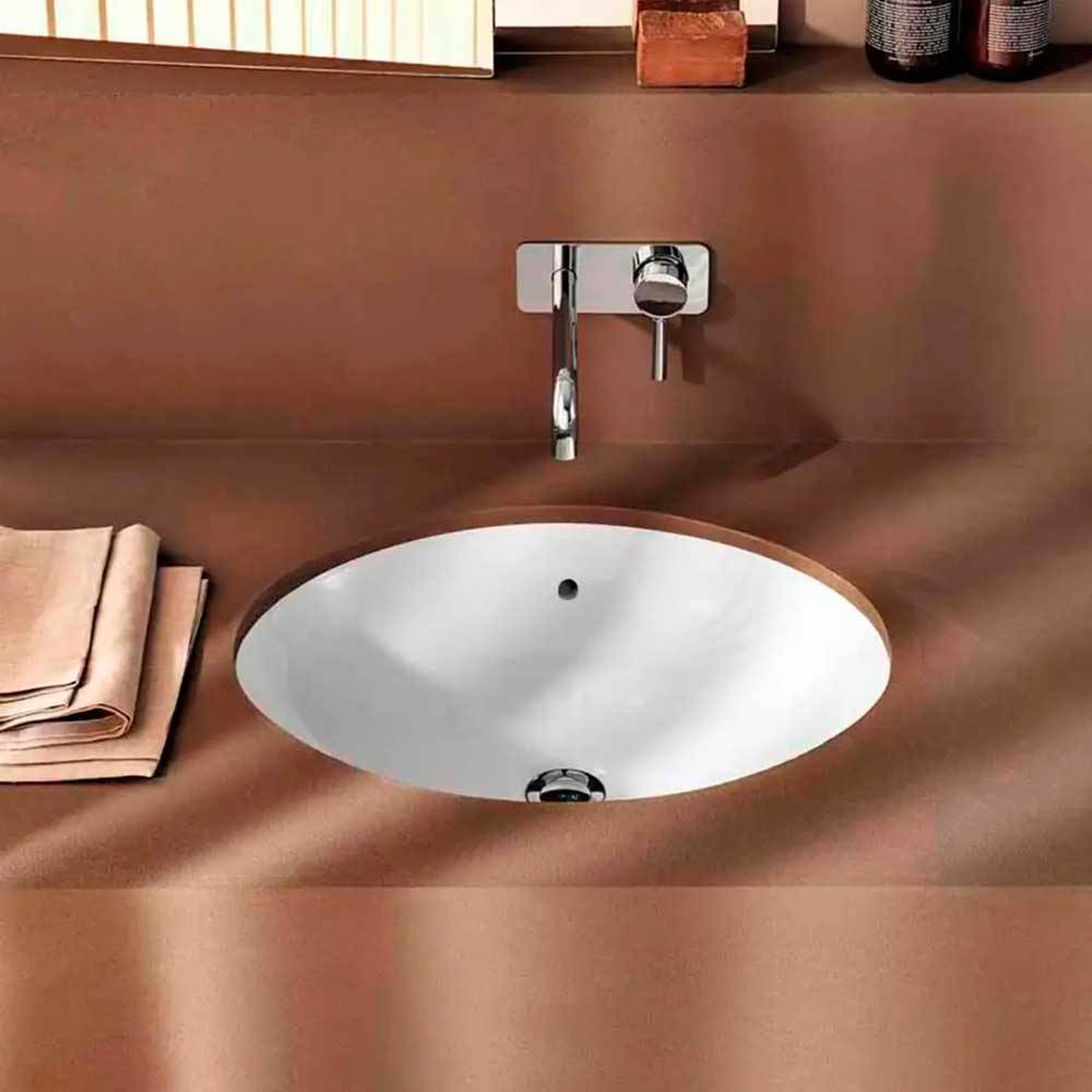 Per il montaggio sottopiano su piani lavabo. Dotato di dima di taglio di carta e materiale di fissaggio. Senza foro per rubinetteria.