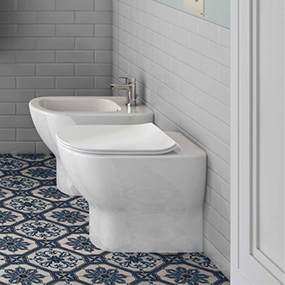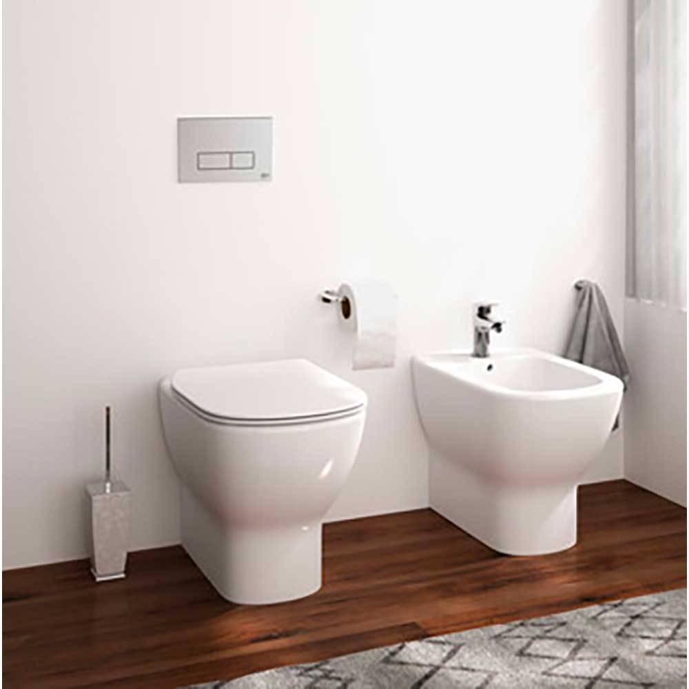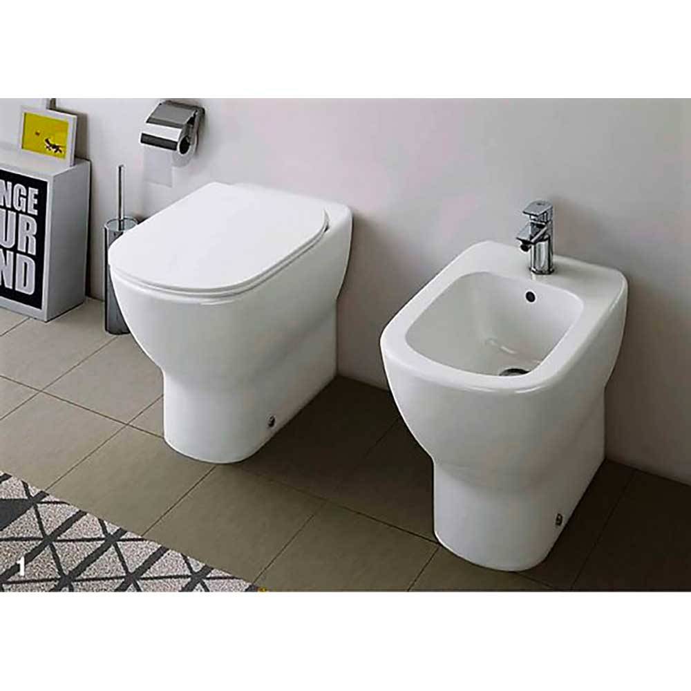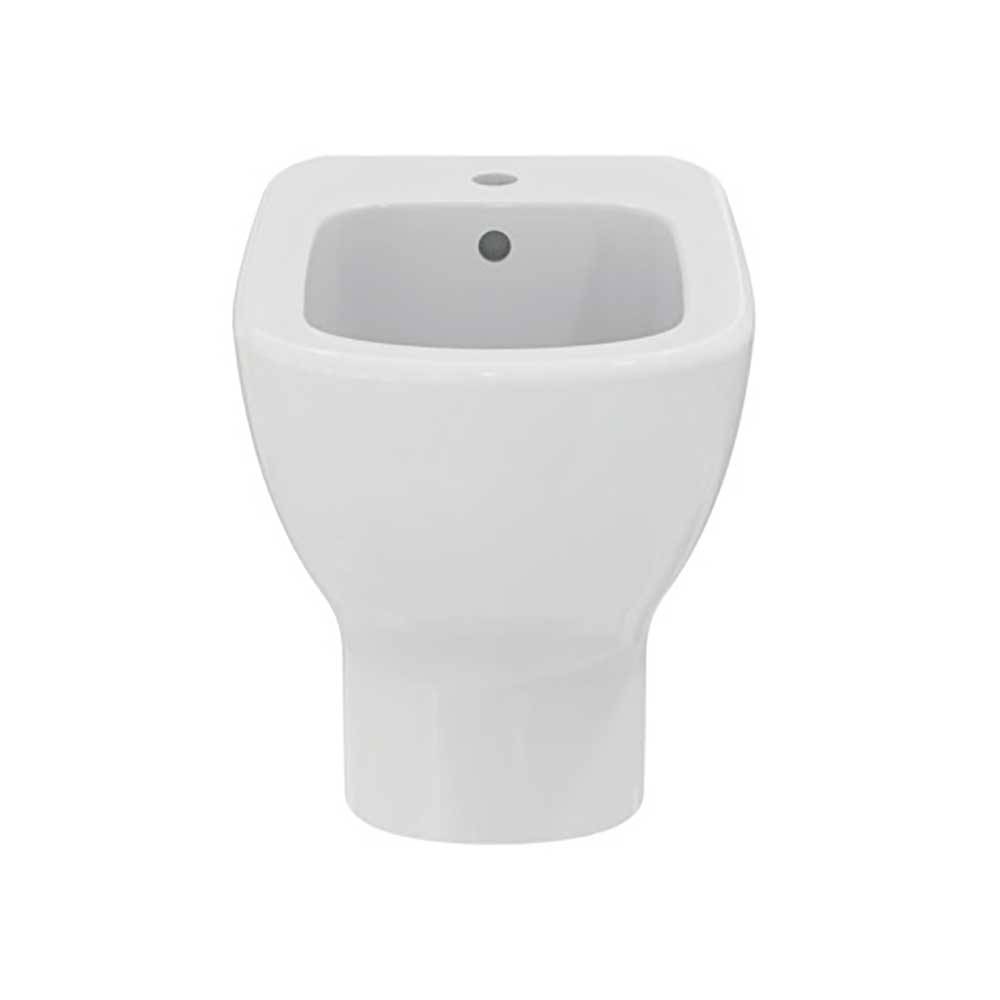 Bidet monoforo per installazione filo parete, con erogazione dell'acqua dal rubinetto. Vi si possono installare sia rubinetti monocomando che monoforo a doppio comando. Il bidet è fornito corredato di fissaggi a pavimento. Articolo disponibile fino ad esaurimento scorte.