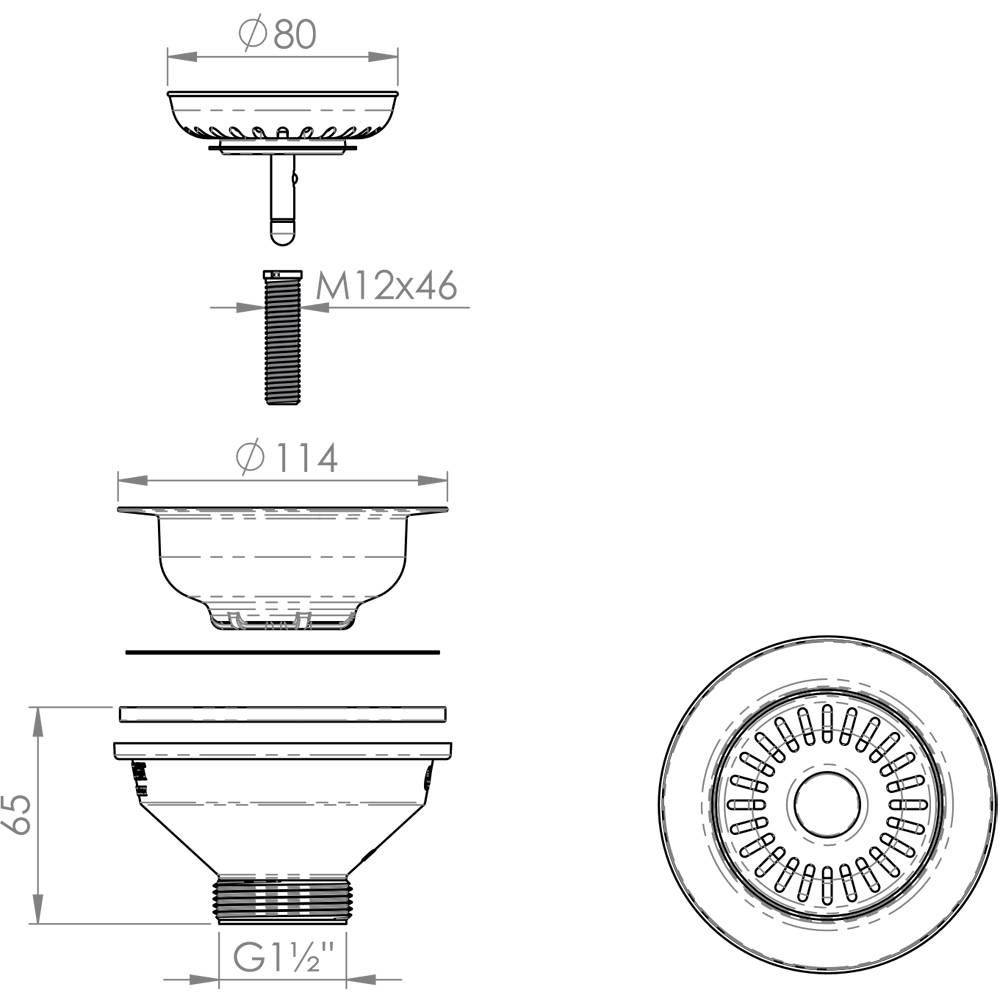 Per lavelli INOX, Sintetici e Ceramica con spessore da 0,5 a 27mm. Piletta in plastica Ø114 mm, tappo cestello con perno e bussola in metallo.