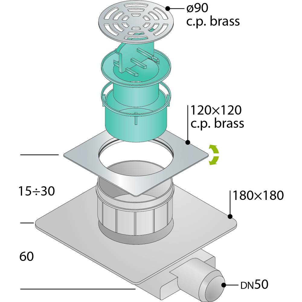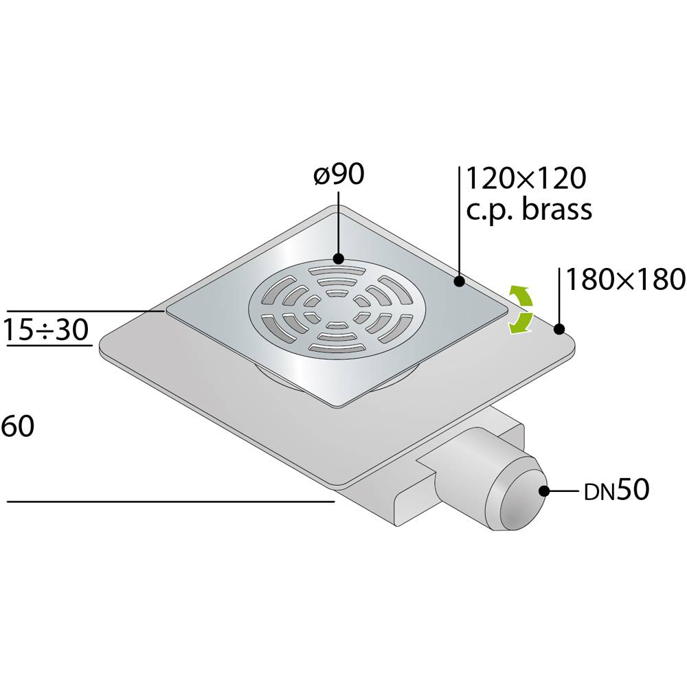 Piletta sifonata per scarico a pavimento in ABS con predisposizione per impermeabilizzazione a letto sottile. Griglia e cornice in ottone cromato regolabili in altezza. Griglia Ø90 modello Standard. Cornice 120x120 orientabile. Flangia anti-infiltrazioni per predisposizione all'impermeabilizzazione a letto sottile senza foglio di impermeabilizzazione. Sifone estraibile per pulizie periodiche. Dry-spot, punto di scolo per l'acqua filtrata dalla pavimentazione uscita laterale DN50 in ABS. Altezza di pavimentazione 15÷30 mm. Ingombro sottotraccia H.60 mm