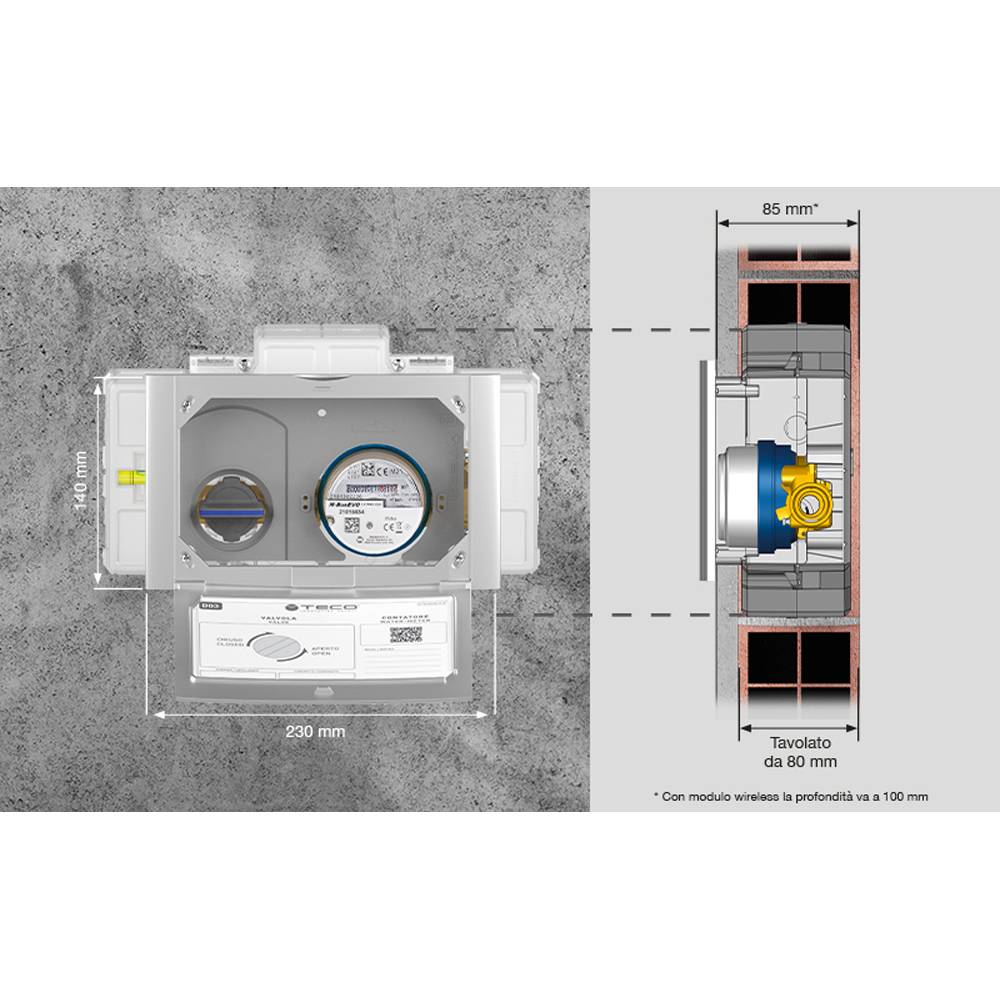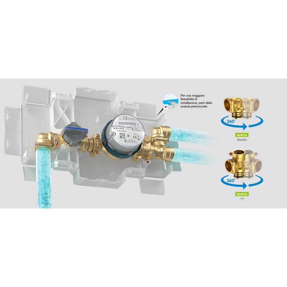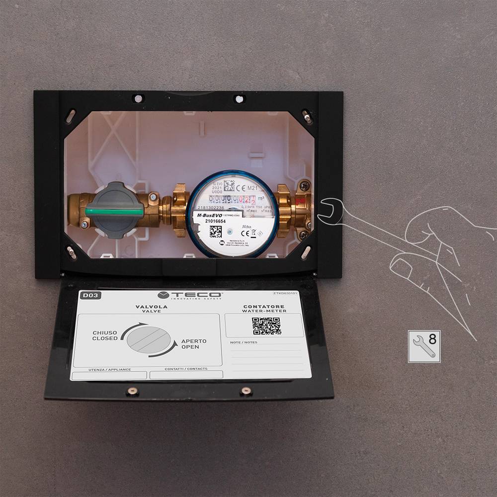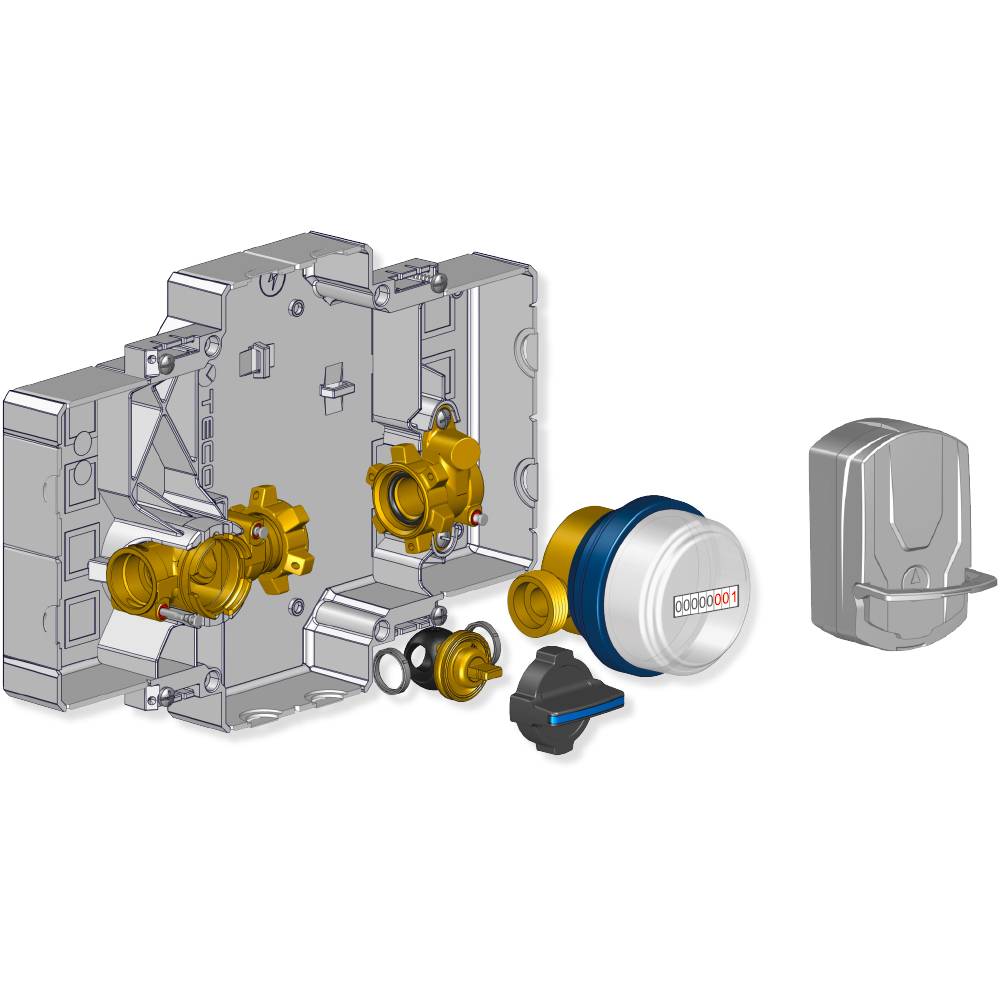 Kit di contabilizzazione compatto da incasso per acqua sanitaria "remotizzabile" premontato in scatola sandwich ispezionabile con parti pre-tranciate. Valvola di intercettazione a sfera estraibile Top Entry con passaggio totale, conforme alla DIN EN13828. Sfera in tecno-polimero e guarnizioni antibloccaggio "Soft Turn". Staffe di fissaggio, bolla di livella e protezione cantiere incluse. Chiusura ed apertura tramite azionamento della maniglia. Perno di manovra compatibile per il montaggio del Motore elettrico ON-OFF con microinterruttore ausiliario nella versione con segnalazione in apertura oppure nella versione con feedback di sicurezza di avvenuta chiusura della valvola. Contatore a getto unico per uso residenziale DN15 per acqua calda o fredda (Lunghezza = 80 mm): ideale per applicazioni divisionali domestiche indoor (submetering). Certificato MID (R max 160) con predisposizione opzionale per emettitore impulsi reed switch o statico. Supporta diverse posizioni di installazione e ha una elevata protezione da campi magnetici esterni. E' dotato di orologeria ruotabile 360°. Le ghiere di fissaggio per il collegamento al contatore sono realizzate con un design specifico per la manutenzione tramite una comune chiave inglese da 8mm. Munito di guarnizioni dedicate per il contatore. Placca di copertura, raccordi, motore e cavo da ordinare separatamente.