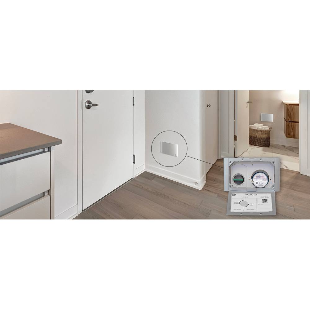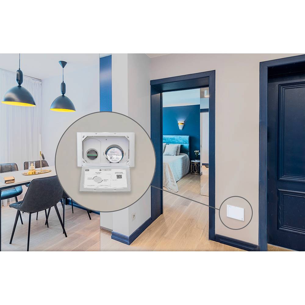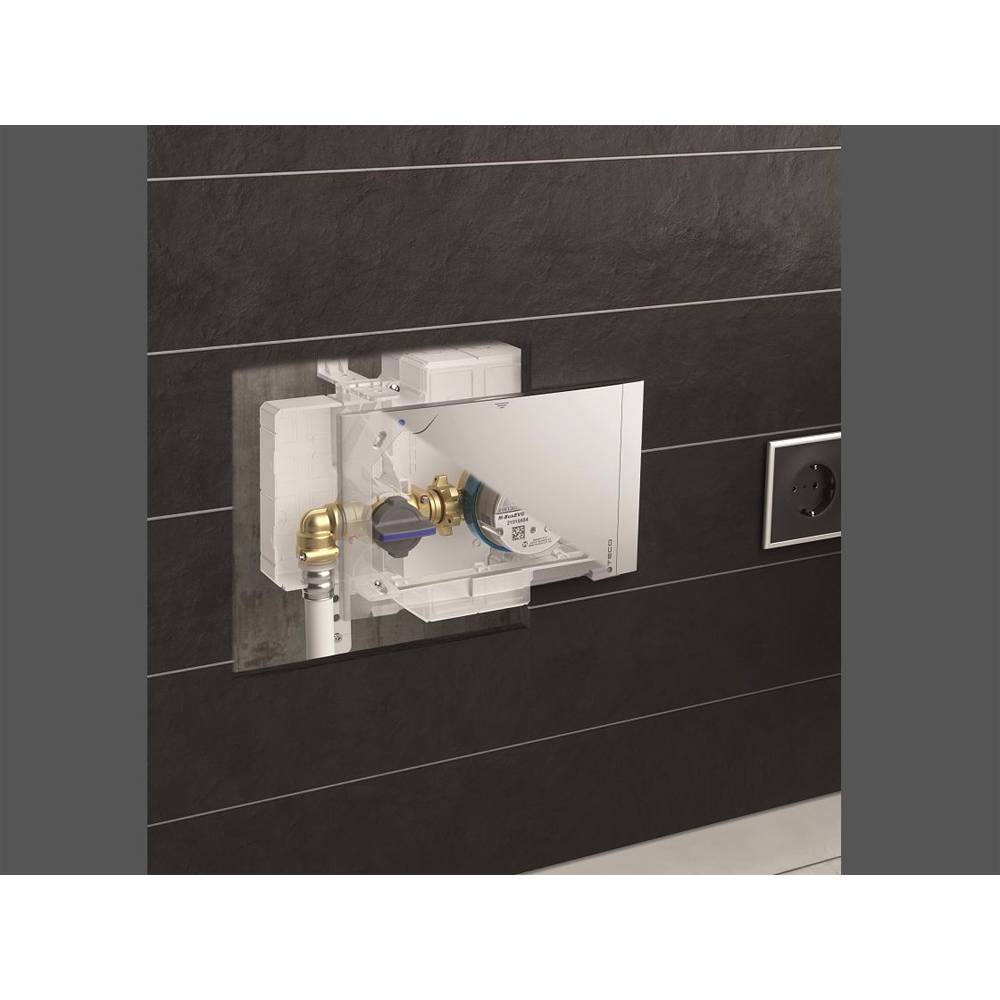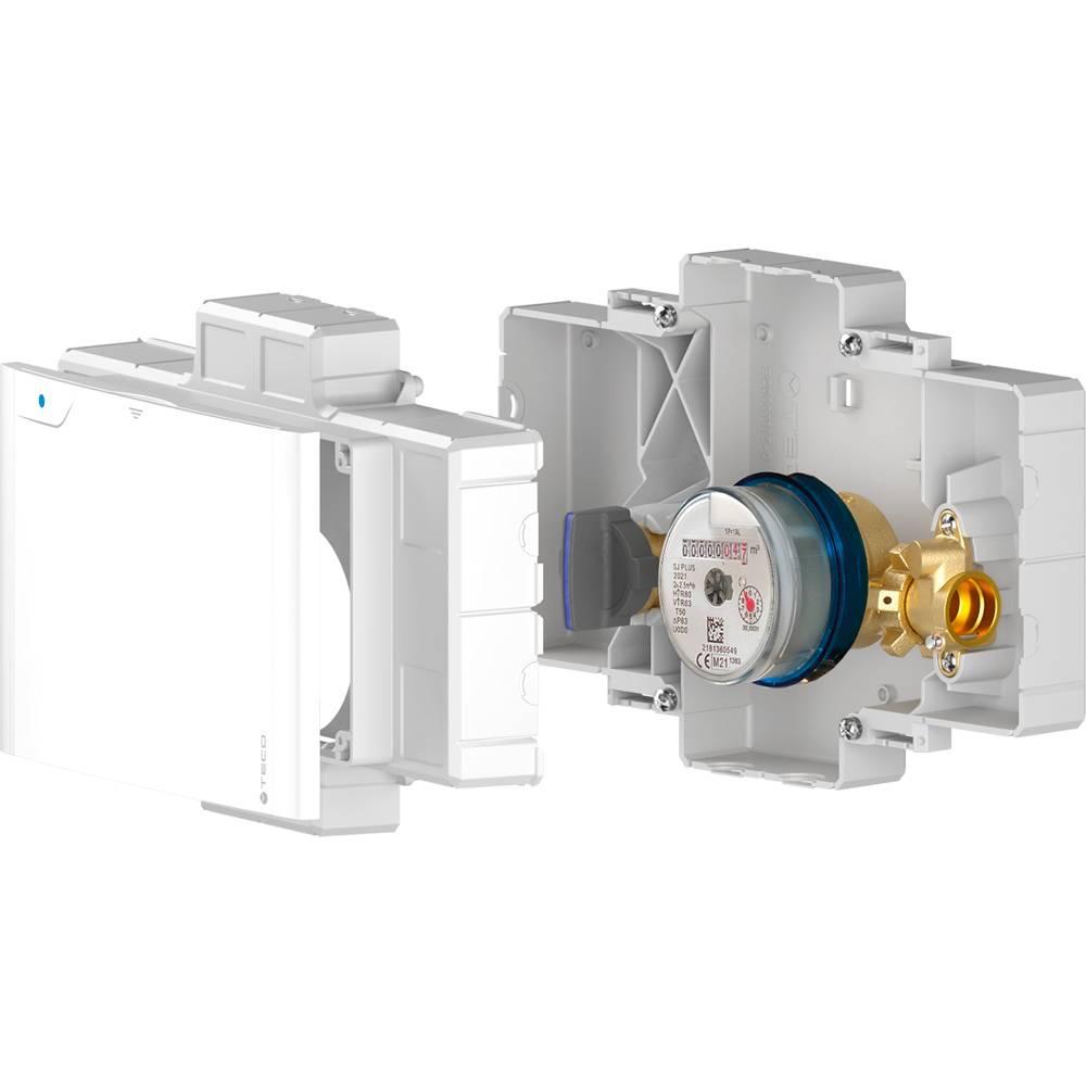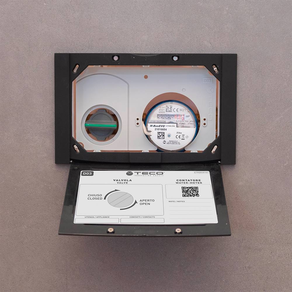 Kit di contabilizzazione compatto da incasso per acqua sanitaria "remotizzabile" premontato in scatola sandwich ispezionabile con parti pre-tranciate. Valvola di intercettazione a sfera estraibile Top Entry con passaggio totale, conforme alla DIN EN13828. Sfera in tecno-polimero e guarnizioni antibloccaggio "Soft Turn". Staffe di fissaggio, bolla di livella e protezione cantiere incluse. Chiusura ed apertura tramite azionamento della maniglia. Perno di manovra compatibile per il montaggio del Motore elettrico ON-OFF con microinterruttore ausiliario nella versione con segnalazione in apertura oppure nella versione con feedback di sicurezza di avvenuta chiusura della valvola. Contatore a getto unico per uso residenziale DN15 per acqua calda o fredda (Lunghezza = 80 mm): ideale per applicazioni divisionali domestiche indoor (submetering). Certificato MID (R max 160) con predisposizione opzionale per emettitore impulsi reed switch o statico. Supporta diverse posizioni di installazione e ha una elevata protezione da campi magnetici esterni. E' dotato di orologeria ruotabile 360°. Le ghiere di fissaggio per il collegamento al contatore sono realizzate con un design specifico per la manutenzione tramite una comune chiave inglese da 8mm. Munito di guarnizioni dedicate per il contatore. Placca di copertura, raccordi, motore e cavo da ordinare separatamente.