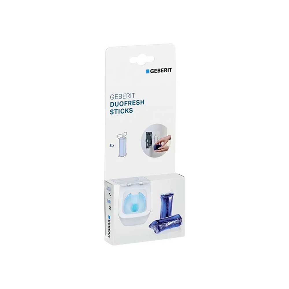 Scatola con 8 stick Geberit DuoFresh. Acqua di risciacquo, colore blu. Profumato, foglio protettivo, solubile in acqua. Biodegradabile.